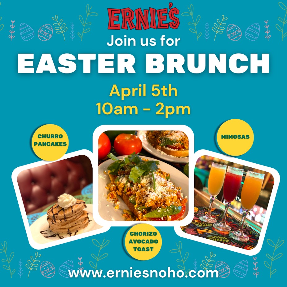 Celebrate Easter Sunday, April 5th between 10am-2pm with a delicious brunch at Ernie's. Featuring favorites like chorizo avocado toast, sweet churro pancakes and refreshing mimosas - don't forget the classics like steak and eggs and chilaquiles. Make your reservations today! We look forward to celebrating with you and your family!